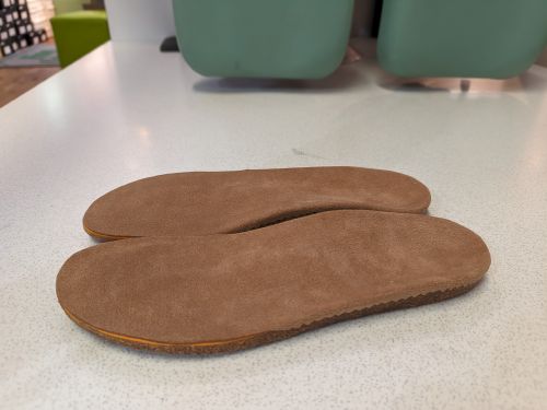 オークカラーのカバーに交換作業作業です。汚れて、靴の中で滑りやくすなったり、クッション材が潰れて履き心地が半減したインソールも修理出来ます。